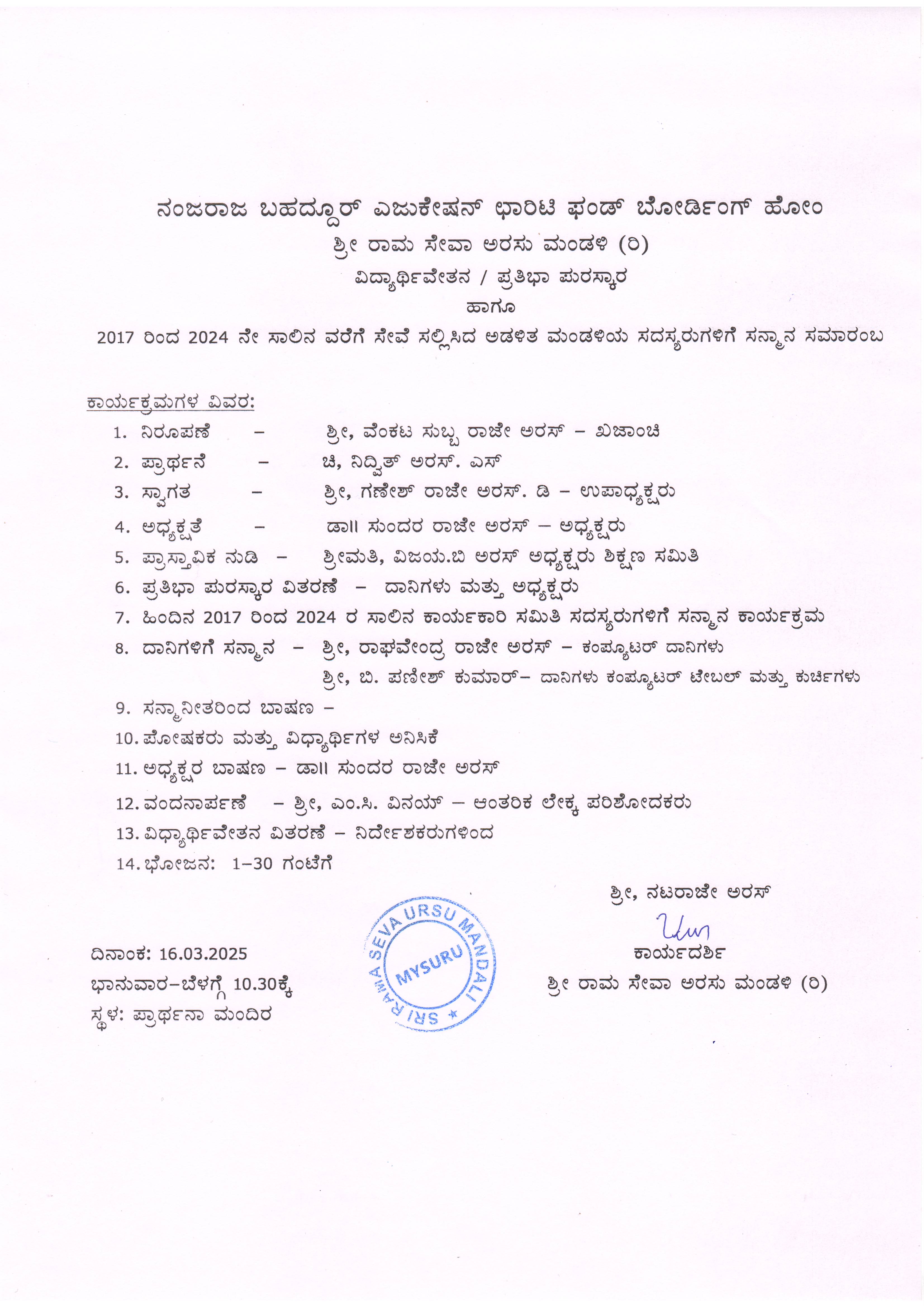 | ಮಾನ್ಯ ಗೌರವಾನ್ವಿತ ಸದಸ್ಯರೆಲ್ಲರಿಗೂ, ಶ್ರೀ ರಾಮ ಸೇವಾ ಅರಸು ಮಂಡಳಿಯ ವಿದ್ಯಾರ್ಥಿವೇತನ ಹಾಗೂ ಪ್ರತಿಭಾ ಪುರಸ್ಕಾರ ಸಮಾರಂಭವು 29 ಮಾರ್ಚ್ 2026 ರಂದು ನಡೆಯಲಿದೆ ಎಂದು ತಿಳಿಸಲು ಸಂತೋಷವಾಗುತ್ತಿದೆ. ಪ್ರತಿಭಾ ಪುರಸ್ಕಾರ ಮತ್ತು ವಿದ್ಯಾರ್ಥಿವೇತನ ಅರ್ಜಿಗಳು 22 ಜನವರಿ 2026ರಿಂದ 23 ಫೆಬ್ರವರಿ 2026ರವರೆಗೆ ಮಂಡಳಿ ಕಚೇರಿಯಲ್ಲಿ ವಿತರಿಸಲಾಗುತ್ತದೆ. (ಕಚೇರಿಯ ಸಮಯದಲ್ಲಿ) ಅರ್ಜಿಗಳನ್ನು ಸಲ್ಲಿಸುವ ಕೊನೆಯ ದಿನಾಂಕ: 23 ಫೆಬ್ರವರಿ 2026 (EOD). ಮಂಡಳಿಯು ವಿತರಿಸುವ ಅರ್ಜಿಯ ಜೊತೆಯಲ್ಲಿ ಅಗತ್ಯ ದಾಖಲೆಗಳೊಂದಿಗೆ ಸಲ್ಲಿಸಬೇಕು. ವಿದ್ಯಾರ್ಥಿವೇತನ ಅರ್ಜಿ – ಷರತ್ತುಗಳು. ಅರ್ಜಿದಾರರು ಮಂಡಳಿಯ ಸದಸ್ಯರ ಕುಟುಂಬದವರಾಗಿರಬೇಕು. ಅರ್ಜಿ ನಿಗದಿತ ಫಾರ್ಮ್ನಲ್ಲಿ ಸಂಪೂರ್ಣವಾಗಿ ಭರ್ತಿ ಮಾಡಿರಬೇಕು. ಕಳೆದ ವರ್ಷದ ಅಂಕಪಟ್ಟಿ ಕಡ್ಡಾಯ.(ಹಿಂದಿನ ಸಾಲಿನ) ಕಳೆದ ವರ್ಷದ ಕಾಲೇಜು/ಶಾಲೆಯ ಶುಲ್ಕ ರಸೀದಿಯನ್ನು ಕಡ್ಡಾಯವಾಗಿ ಲಗಧಿಸಬೇಕು ಅಪೂರ್ಣ ಅರ್ಜಿಗಳನ್ನು ಸ್ವೀಕರಿಸಲಾಗುವುದಿಲ್ಲ. ಅರ್ಜಿ ಸಲ್ಲಿಸುವ ಕೊನೆಯ ದಿನಾಂಕದ ನಂತರ ಸ್ವೀಕಾರವಿಲ್ಲ. ಮಂಡಳಿಯ ನಿರ್ಣಯ ಅಂತಿಮ. ದಯವಿಟ್ಟು ಈ ಮಾಹಿತಿಯನ್ನು ಅಗತ್ಯವಿರುವವರಿಗೆ ತಿಳಿಸಿ ಮತ್ತು ಸಹಕರಿಸಿ. ಇಂತಿ, ಕಾರ್ಯಕಾರಿ ಸಮಿತಿ ಶ್ರೀರಾಮ ಸೇವಾ ಅರಸು ಮಂಡಳಿ ಮೈಸೂರು. |